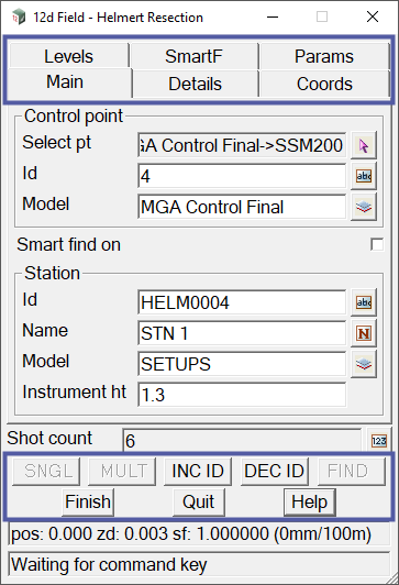 The Main tab on the 12d Field – Helmert Resection panel also has the option to toggle Smart find on or off. Continue down this page to learn more about Smart find.