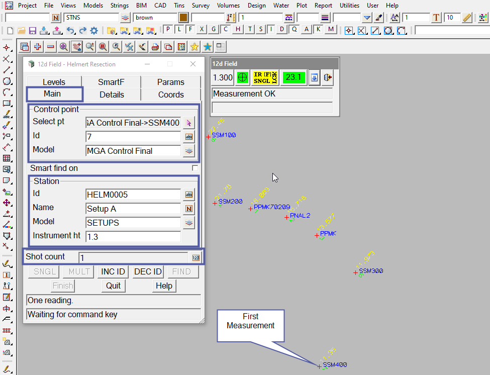 In the image below, SSM400 (the point that the first measurement will be taken at) has been selected and a instrument height of 1.3 has been entered. After taking the measurement a shot count of 1 is displayed.