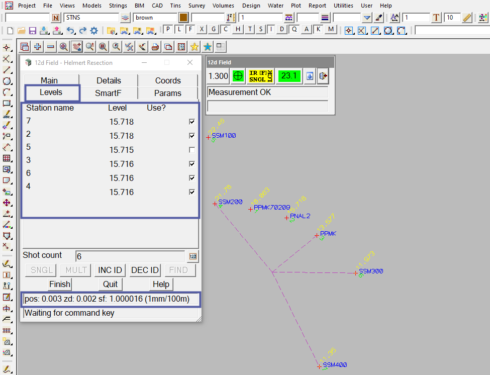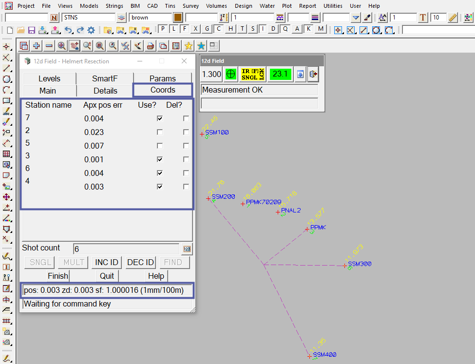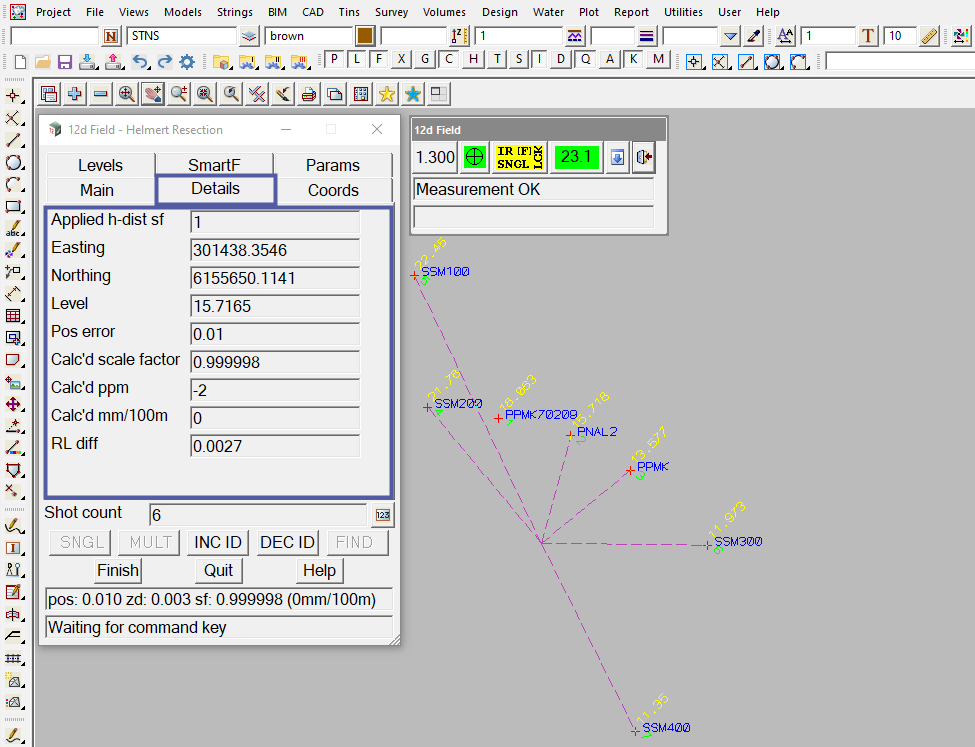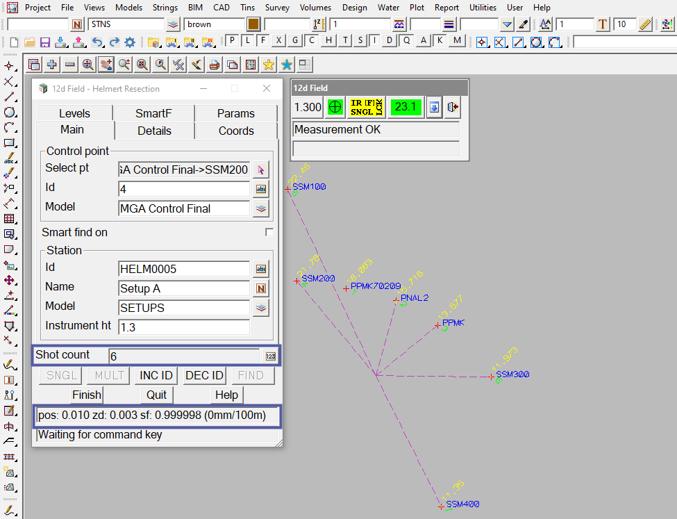 Note: The output window on the 12d Field – Helmert Resection panel states the positional accuracy of the resection being pos: 0.010, zd: 0.003, sf: 0.999998 (0mm/100m).