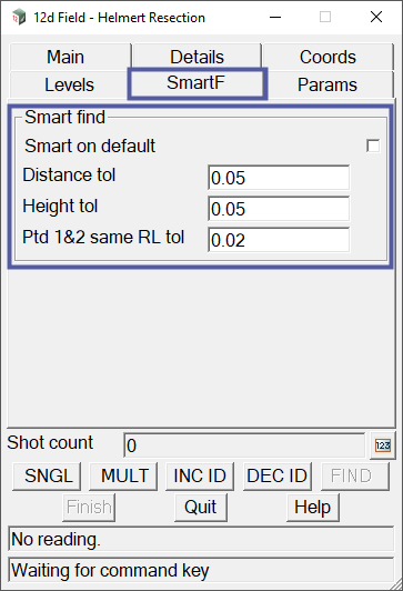 The SmartF tab on the 12d Field – Helmert Resection panel allows the user to set the maximum tolerances that 12d Field will accept for a shot to be out of its true position when using smart find. It also allows the user to have smart find toggled on or off by default.