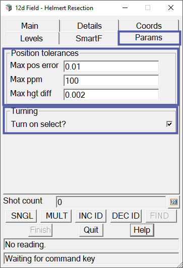 The Params tab on the 12d Field – Helmert Resection panel allows the user to set the tolerances 12d Field will accept in establishing the helmert station. If the resection positional tolerances are not within the set parameters a warning will be displayed, after pressing the finish button, and an option to accept or decline the setup will be given.