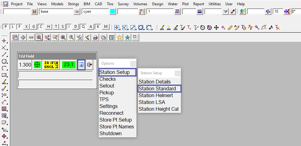 To view the 12d Field – Instrument Setup panel, Use: Show Options => Station Setup => Station Standard