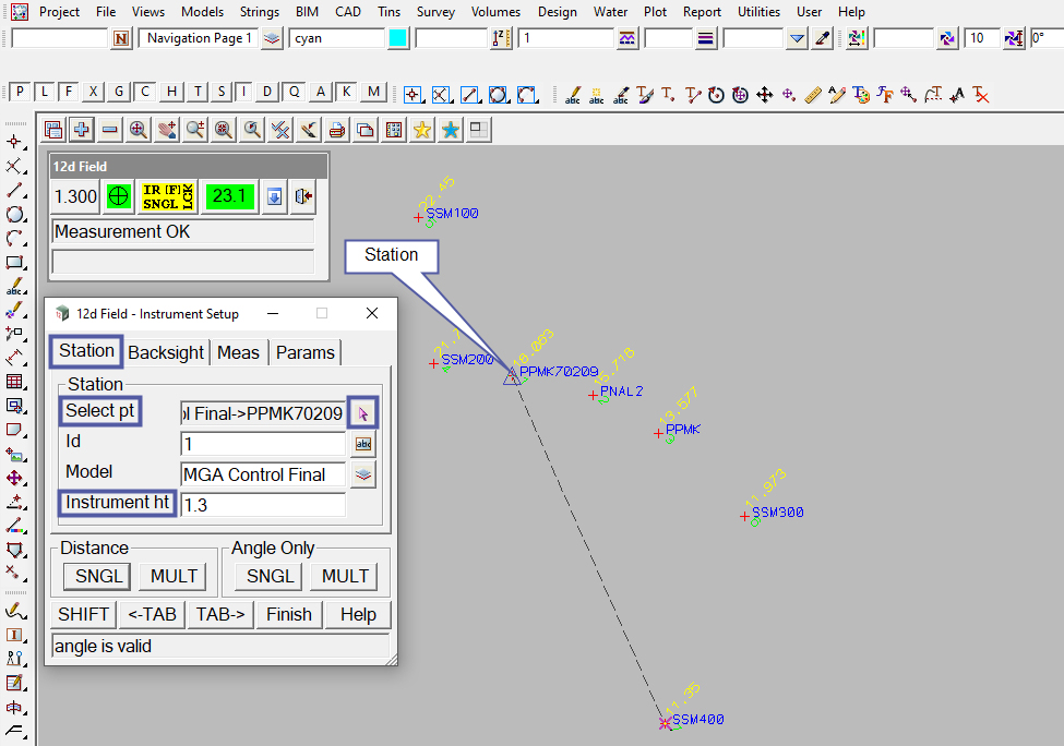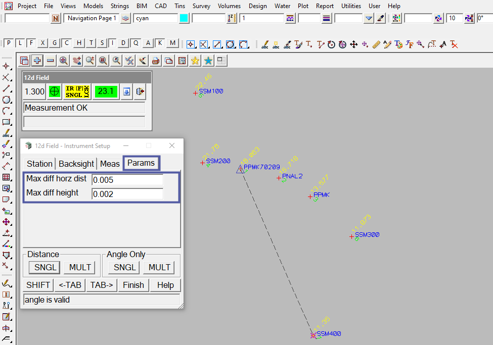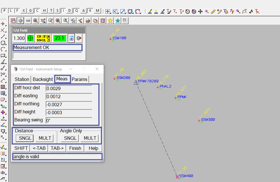 Note: The output window on the 12d Field – Instrument Setup panel states that the angle is valid for the recent measurement. Also the output window for the 12d Field Control Bar states that the measurement went ok.