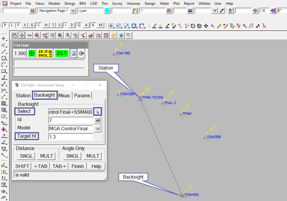 In the image below, SSM400 (the point that the backsight shot will be taken at) has been selected and a target height of 1.3 has been entered.