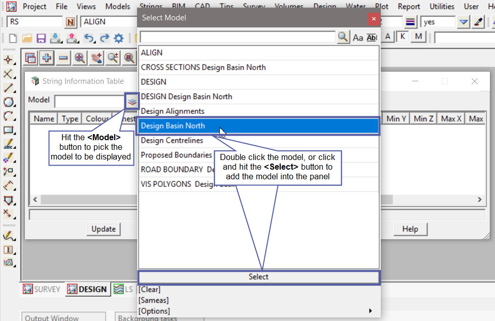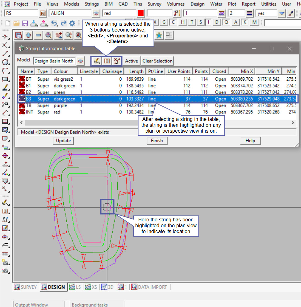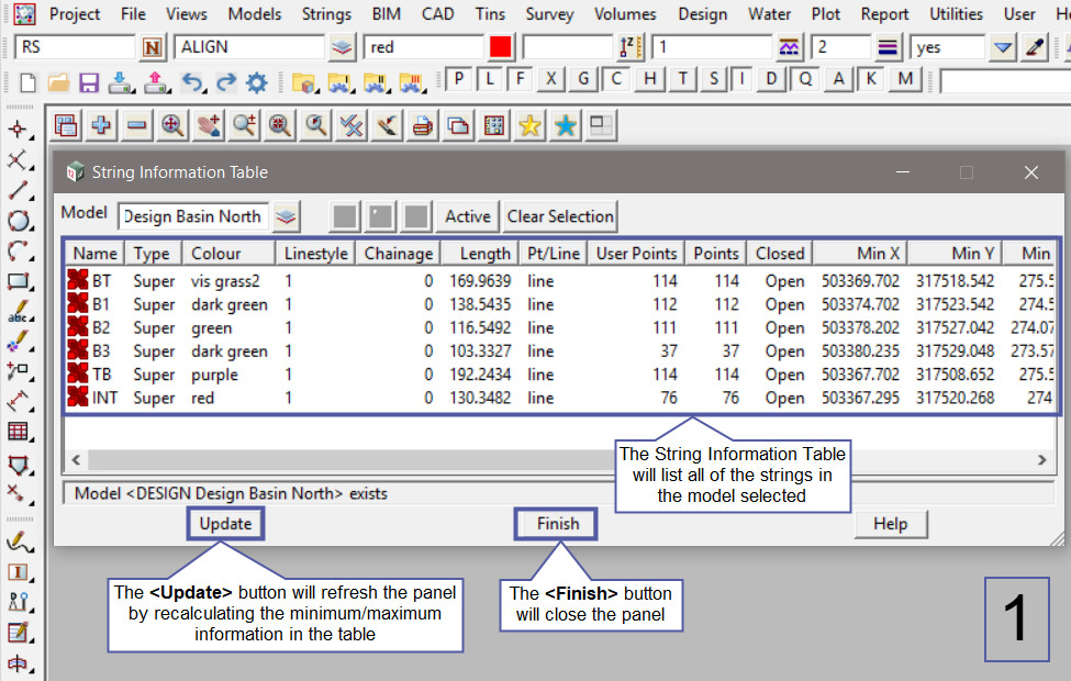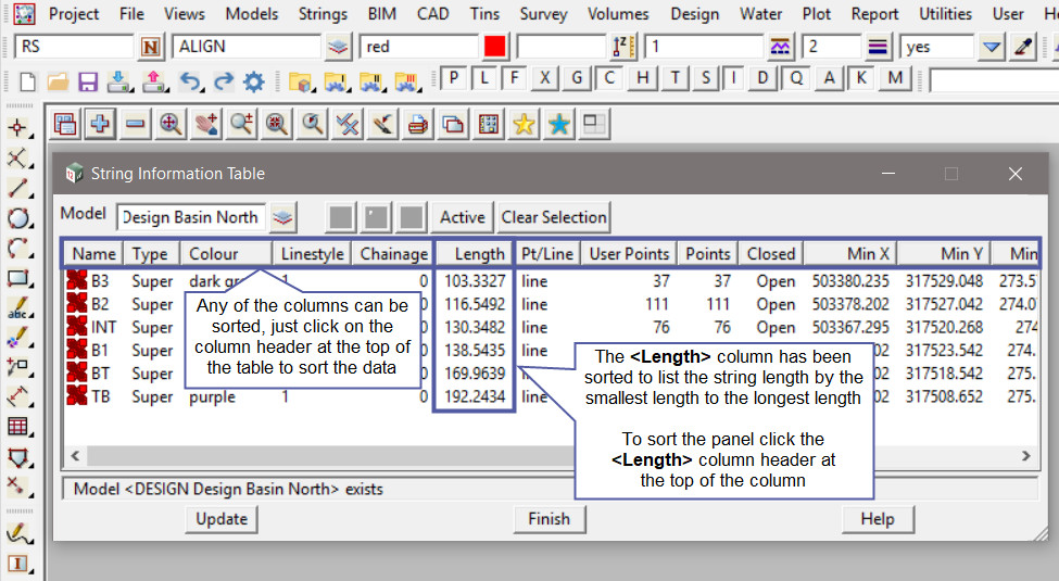 - Type – the string type is listed in the Type column, ie Super, Super Alignment, Drainage, Face. A Tin will also be listed as a string type.