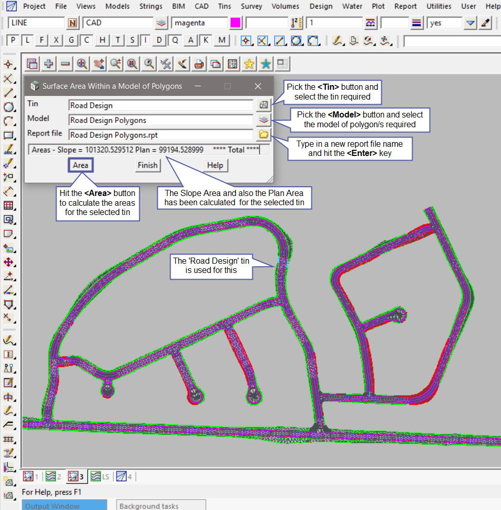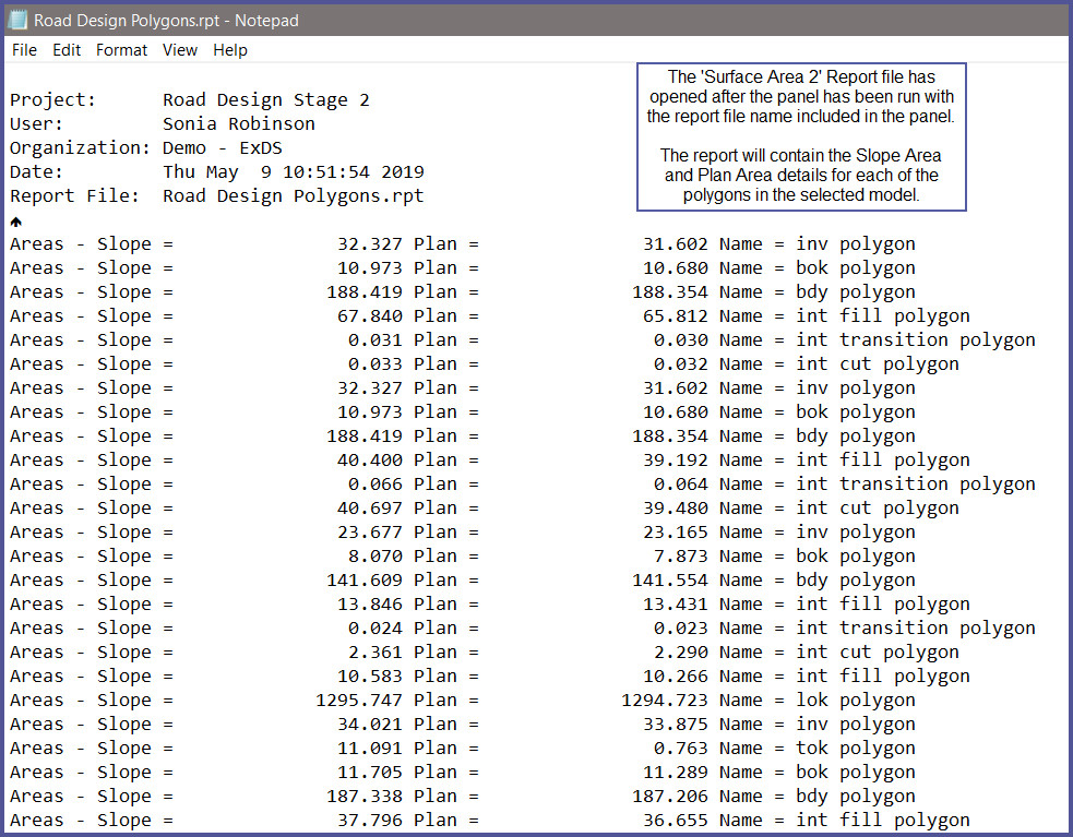 The report will contain the surface area and plan area details for each of the polygons in the selected model.