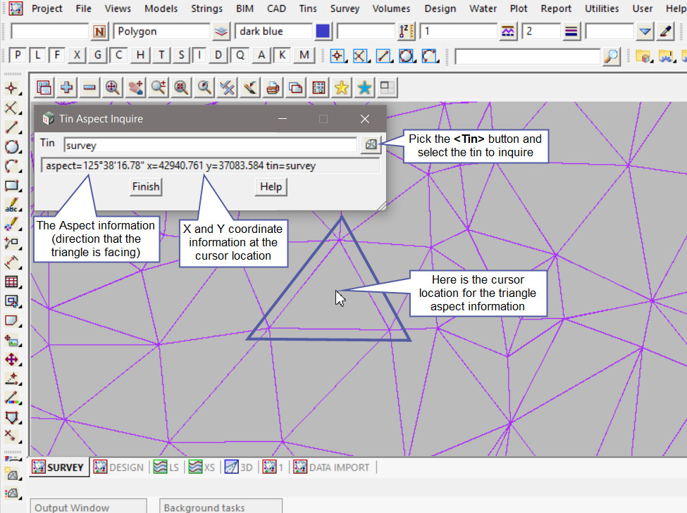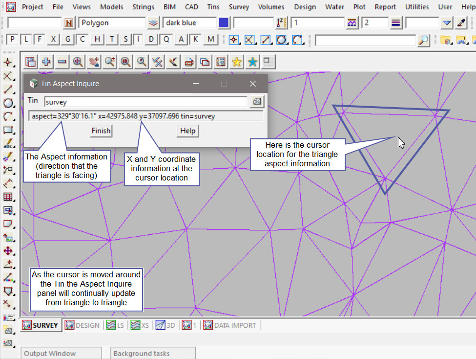 Move the mouse around the selected tin and see the panel calculate and display the aspect information for each triangle. The panel will also display the X and Y coordinates for the cursor position.