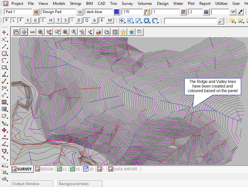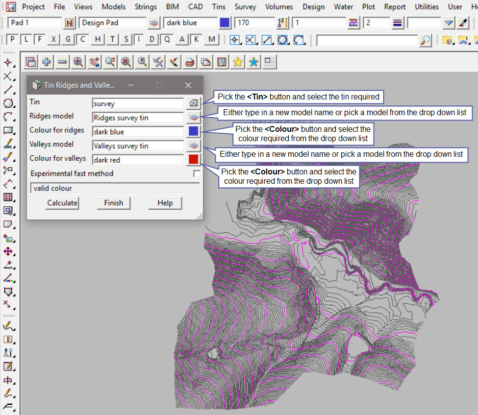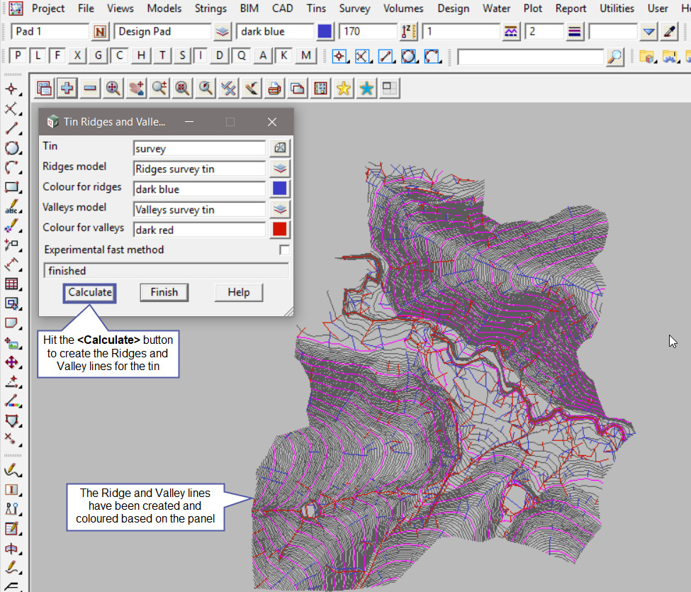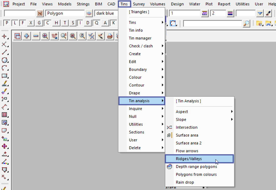 To view the Tin Ridges and Valleys Panel, Use: Tins => Tin Analysis => Ridges/Valleys