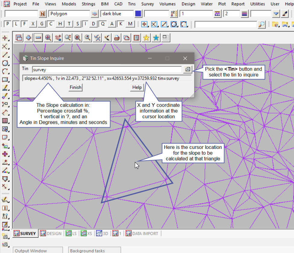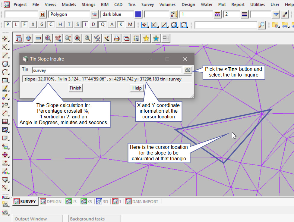 This option is used to calculate and display the slope of triangles in a Tin at a cursor location.