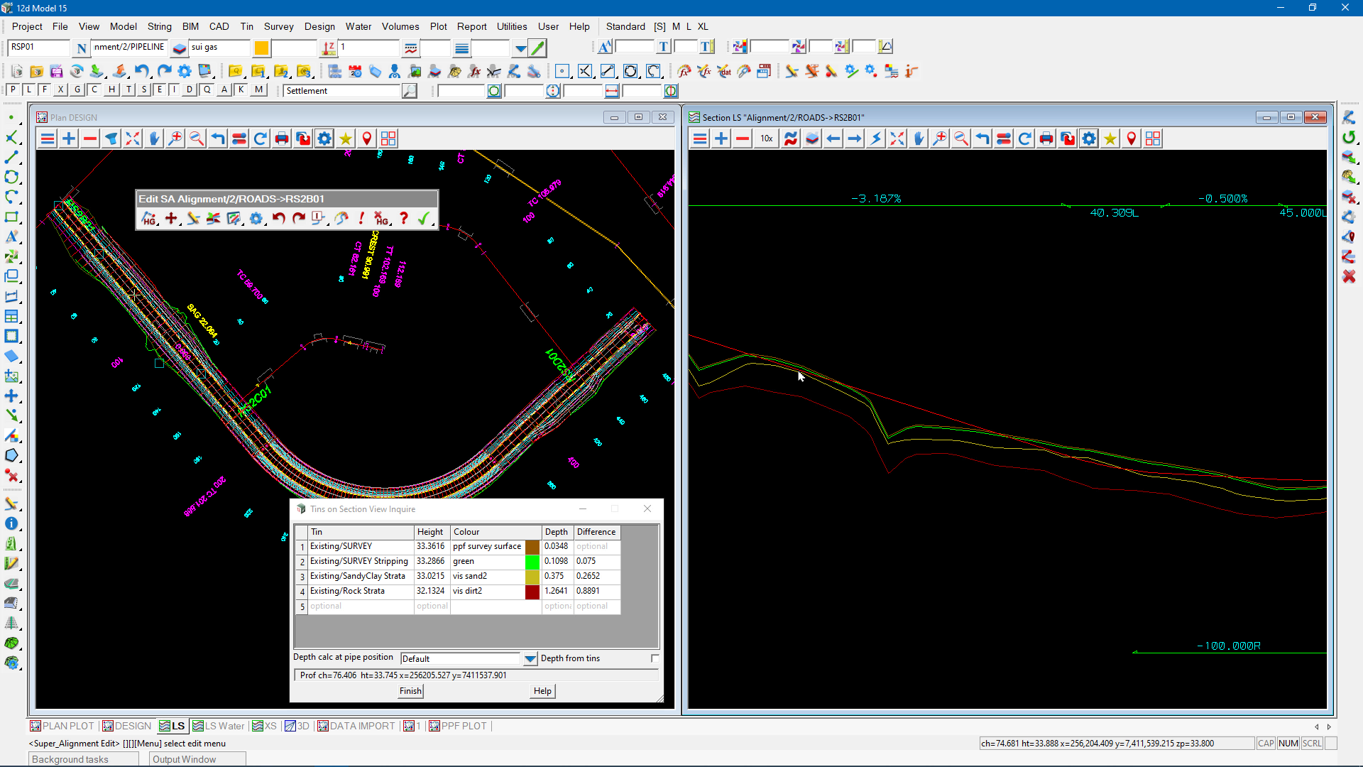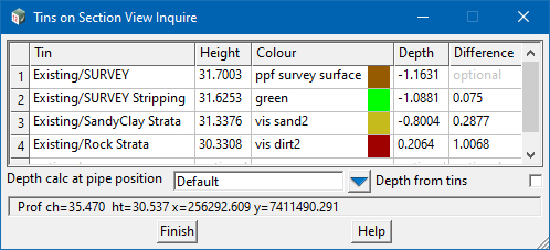 As the cursor is moved over any section view, the “Tins on a Section View” option lists all the tins and super tins on that view, and at the (Ch,Ht) location of the cursor, dynamically displays the z-value of each tin or supertin at that (x,y) location.