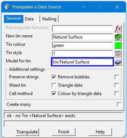 | Model for tin | The “layer” where the triangles are stored. | Best practice is to keep it the same as the TIN name. 12d defaults to “tin [Name]” if left blank. |