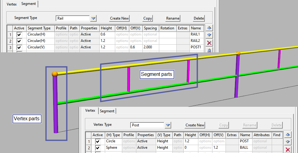Using a simple pedestrian railing as an example, the corner posts will be vertex parts, whilst the railing AND intermediate posts will be segment parts.