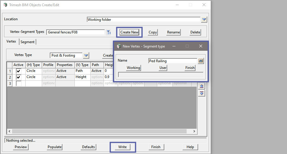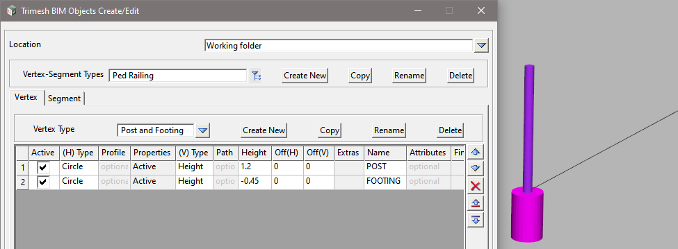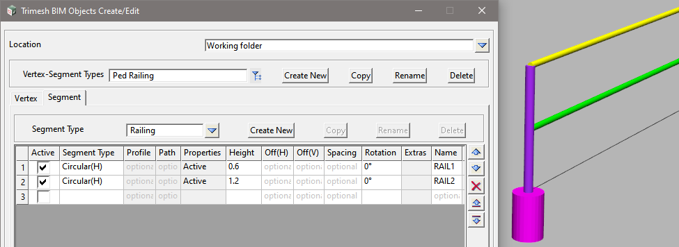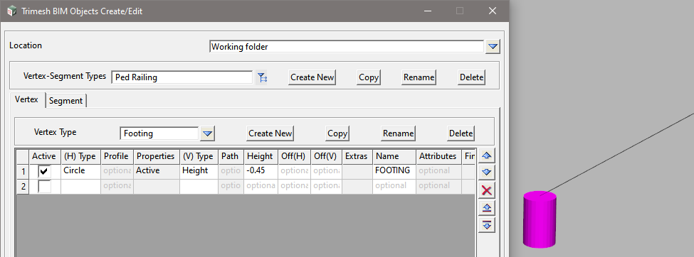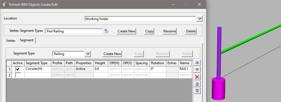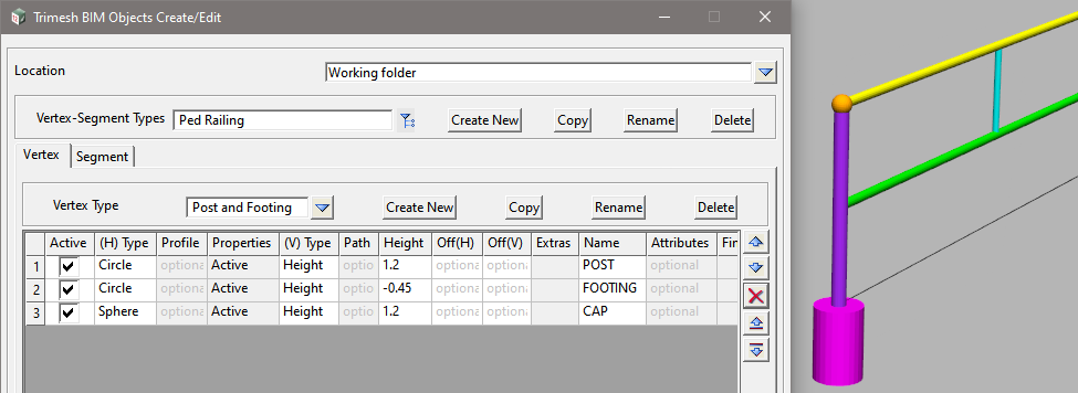 <Create New> to add a new Vertex-Segment Type and enter the Name: Ped Railing, then select <Working>.