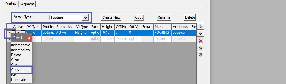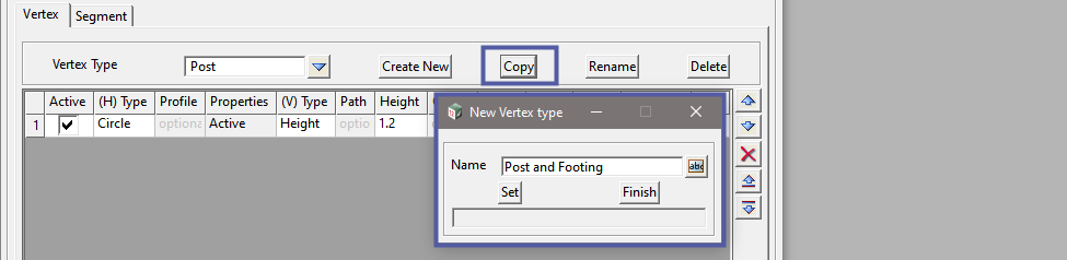 On the Vertex tab, select <Create New> and add a Vertex Type: Footing, then <Set> and <Finish> .