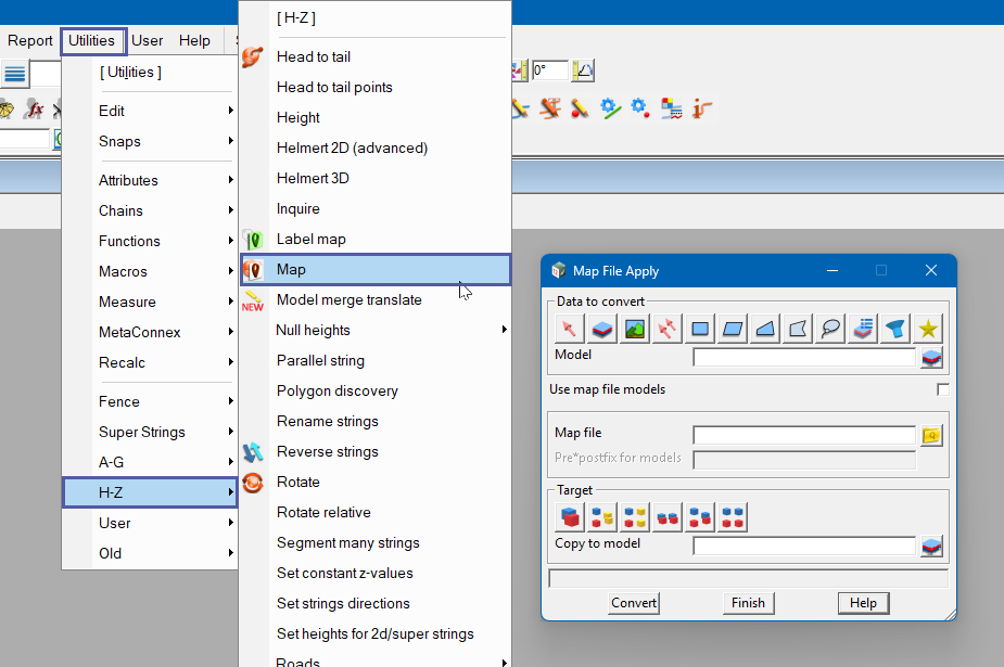 This option is also available under “File => Map Files => Apply” it is well documented with example videos and instructions available on www.12dModeltraining.com.au website. Applying Mapfiles To open this panel, Use: Utilities => H-Z => Map Tagged: Map FileMapfileApply Mapfile