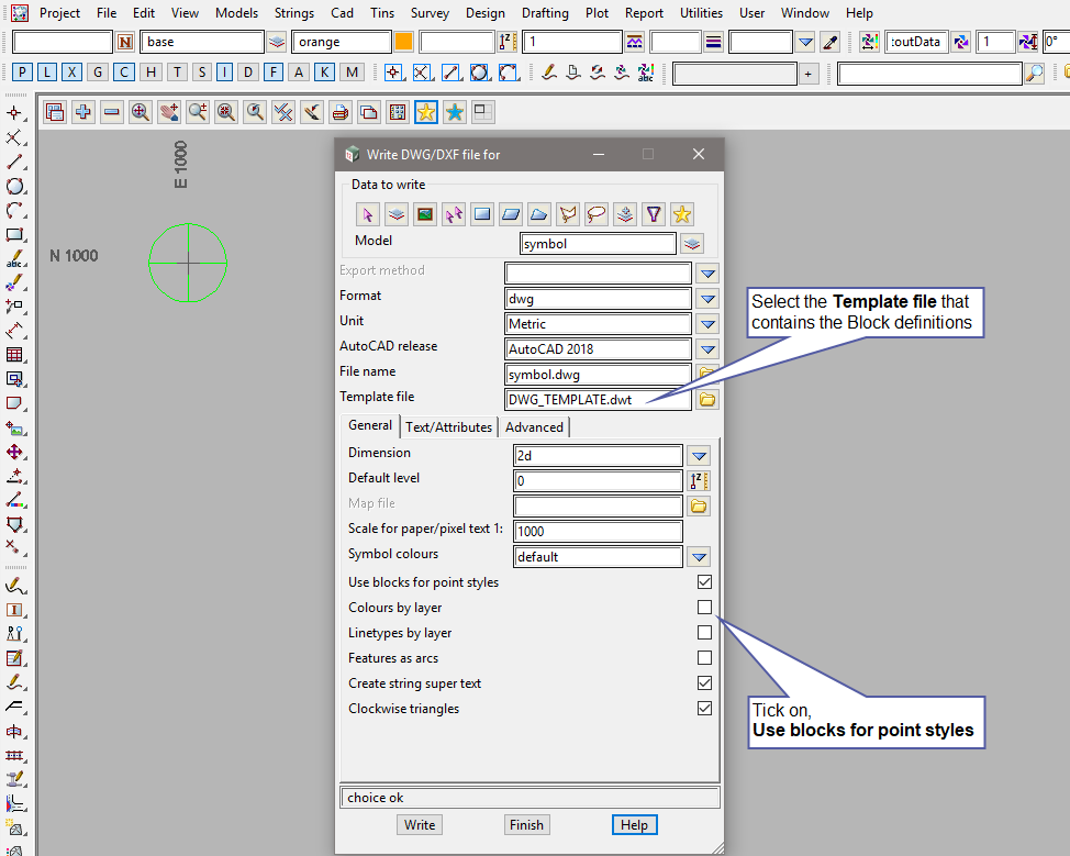 Alternatively, you can use a DWT (template) with the Attributed Block definition already created. 12d Model will map the Symbol names to the Block names, and the Vertex Attributes to matching Block Attributes. This allows exporting of Symbols to meet your company or client’s CAD Standards.