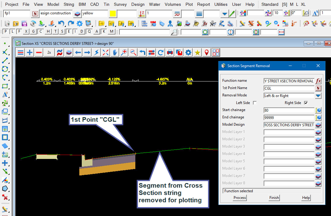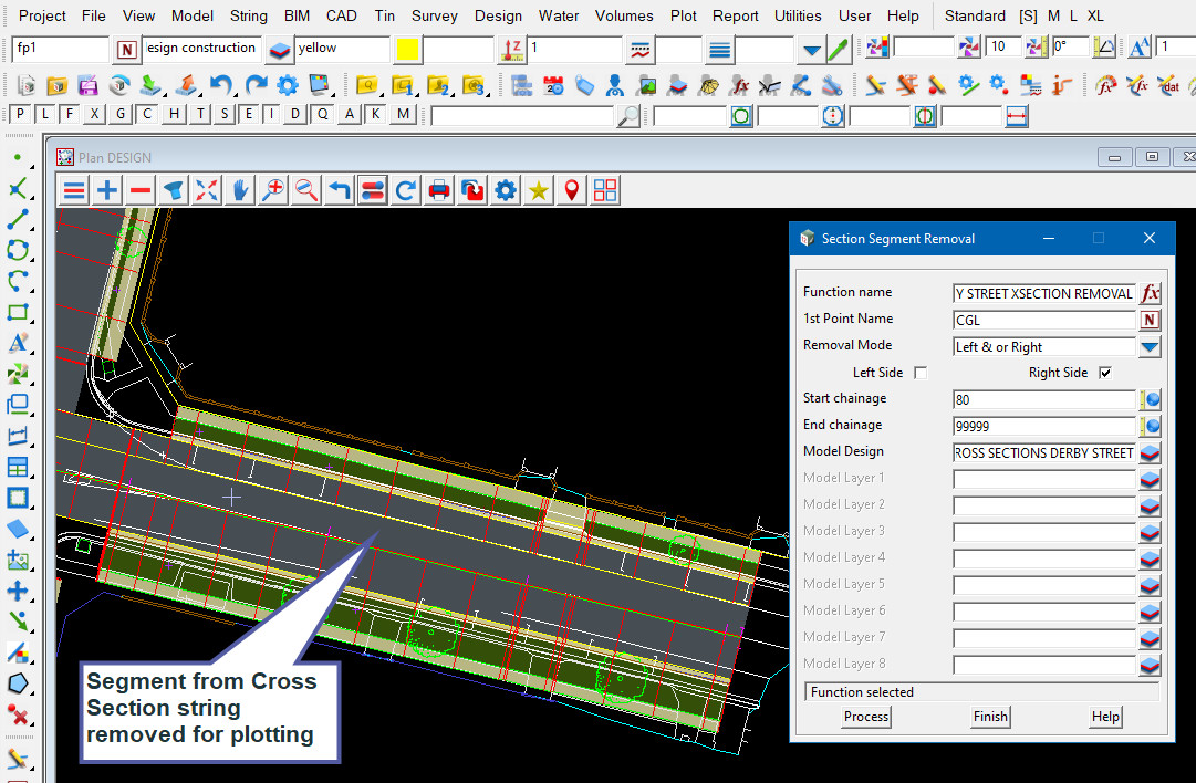 This option is know as “Section Segment Removal” and can be selected from the 12d “Road” toolbar or opened via the main menu.